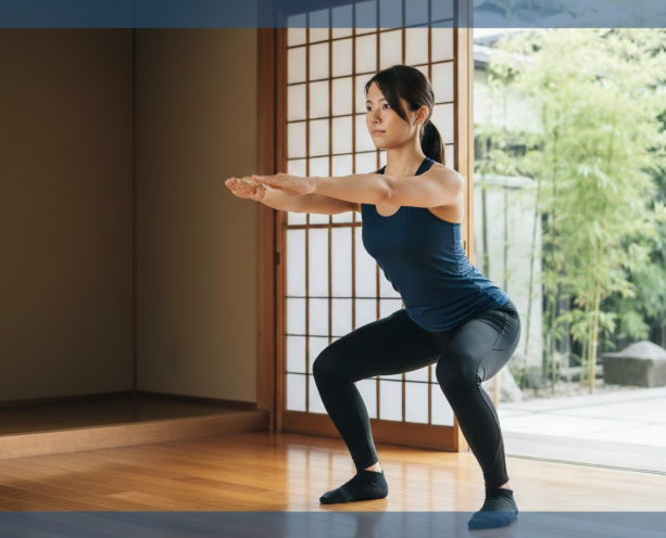 1、スクワット(下半身の安定) 居合の基本は、とにかく下半身。ゆっくり腰を下ろして、大地を踏みしめる感覚を養いましょう。これで居合腰で演武している時のプルプルが、グッと楽になります。