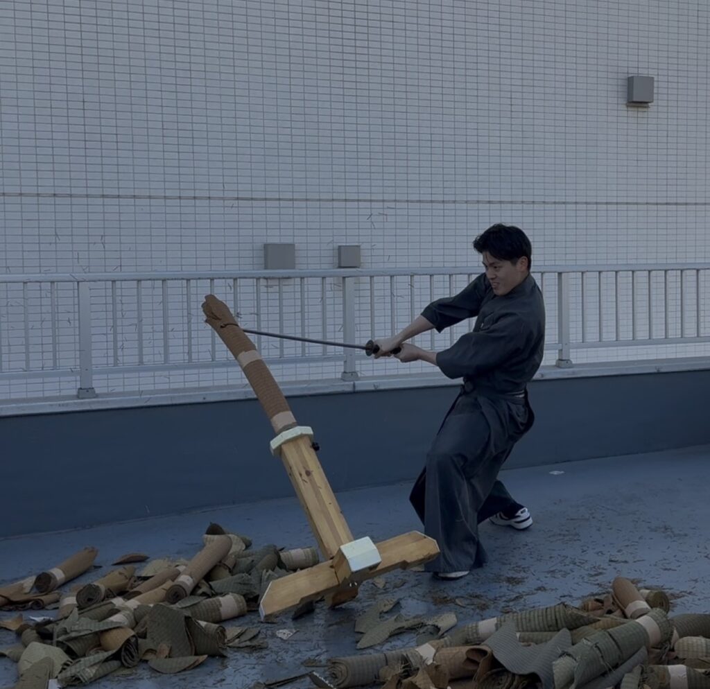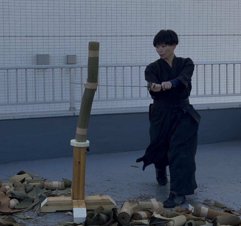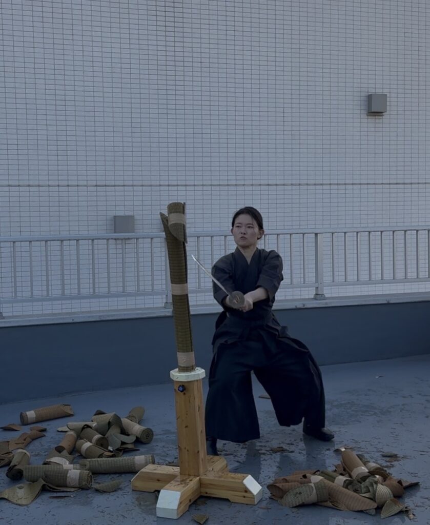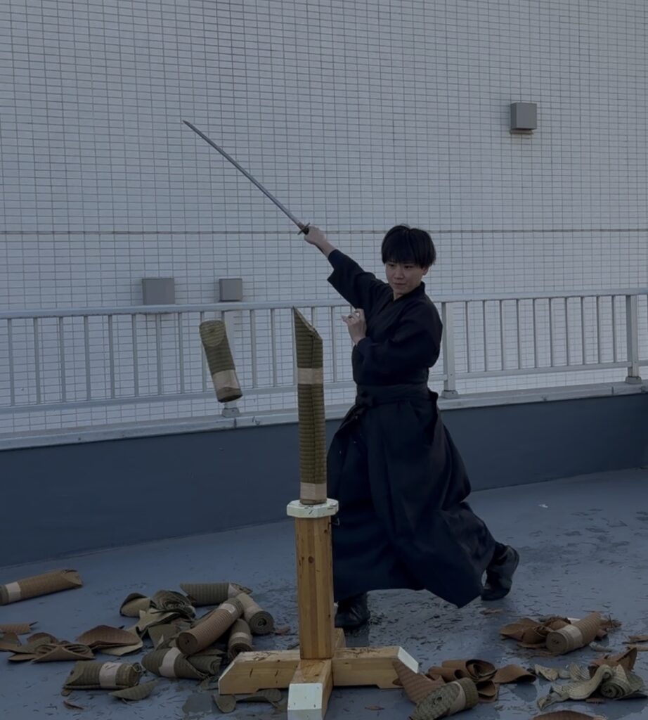 ●「水平」の壁と、寒さに負けない集中力 いざ実技が始まると、それぞれの課題が見えてきます。 基本の袈裟切りはなんとか形になり、綺麗に切れると爽快感があるのですが……難しいのが水平に切ること! 刃筋が少しでも寝たり起きたりすると、途端に畳表が応えてくれません。「真っ直ぐ」の難しさを改めて痛感し、居合の奥深さを再確認する時間となりました。