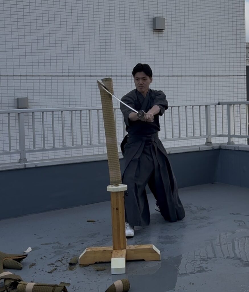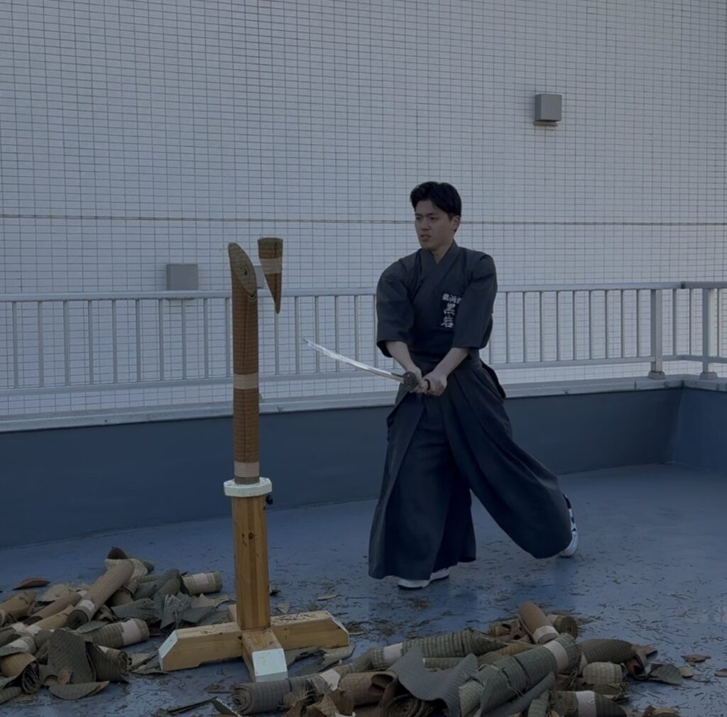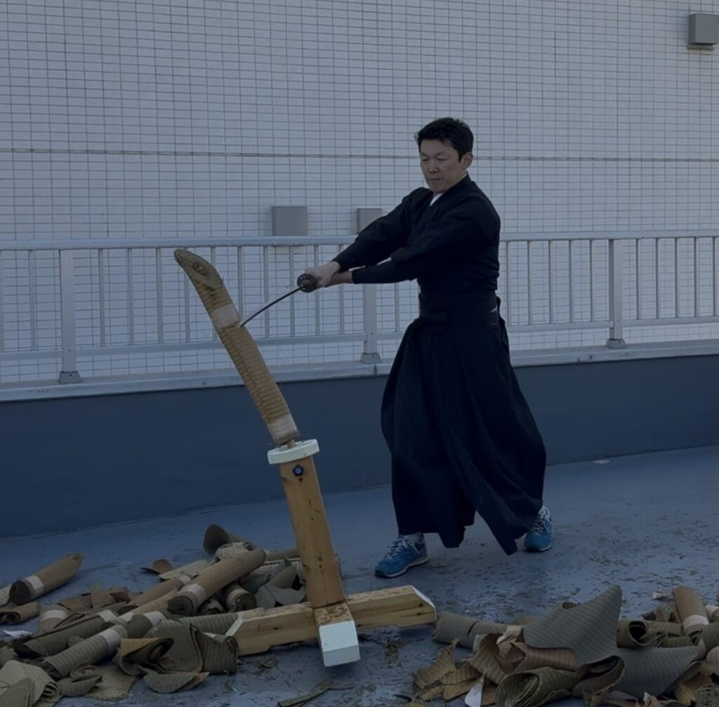 ●「水平」の壁と、寒さに負けない集中力 いざ実技が始まると、それぞれの課題が見えてきます。 基本の袈裟切りはなんとか形になり、綺麗に切れると爽快感があるのですが……難しいのが水平に切ること! 刃筋が少しでも寝たり起きたりすると、途端に畳表が応えてくれません。「真っ直ぐ」の難しさを改めて痛感し、居合の奥深さを再確認する時間となりました。