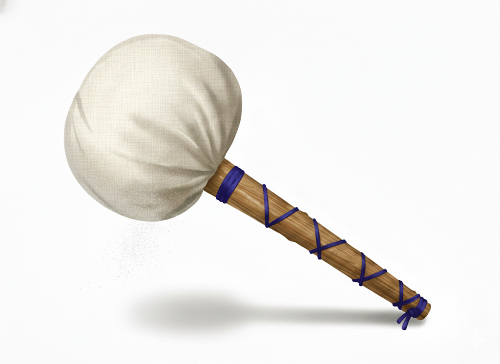 まずは、てるてる坊主のような形をした「打ち粉」。 中には微細な砥石の粉が入っています。刀身をポンポンと叩いて粉をまぶし、古い油分や汚れを浮き立たせます。時代劇などで武士が刀をポンポンしている、あの憧れのシーンですね!
