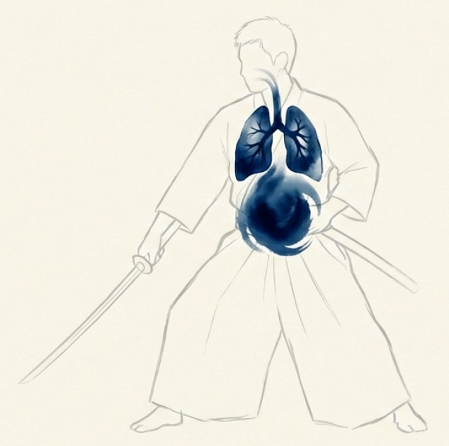よく「腹式呼吸」という言葉を耳にすると思いますが、居合の呼吸もまさにそれ。 鼻から吸った空気を、おへその下の「丹田(たんでん)」まで送り込むようなイメージで、口から**「ふぅ~」とお腹の底から意識して吐き出します。